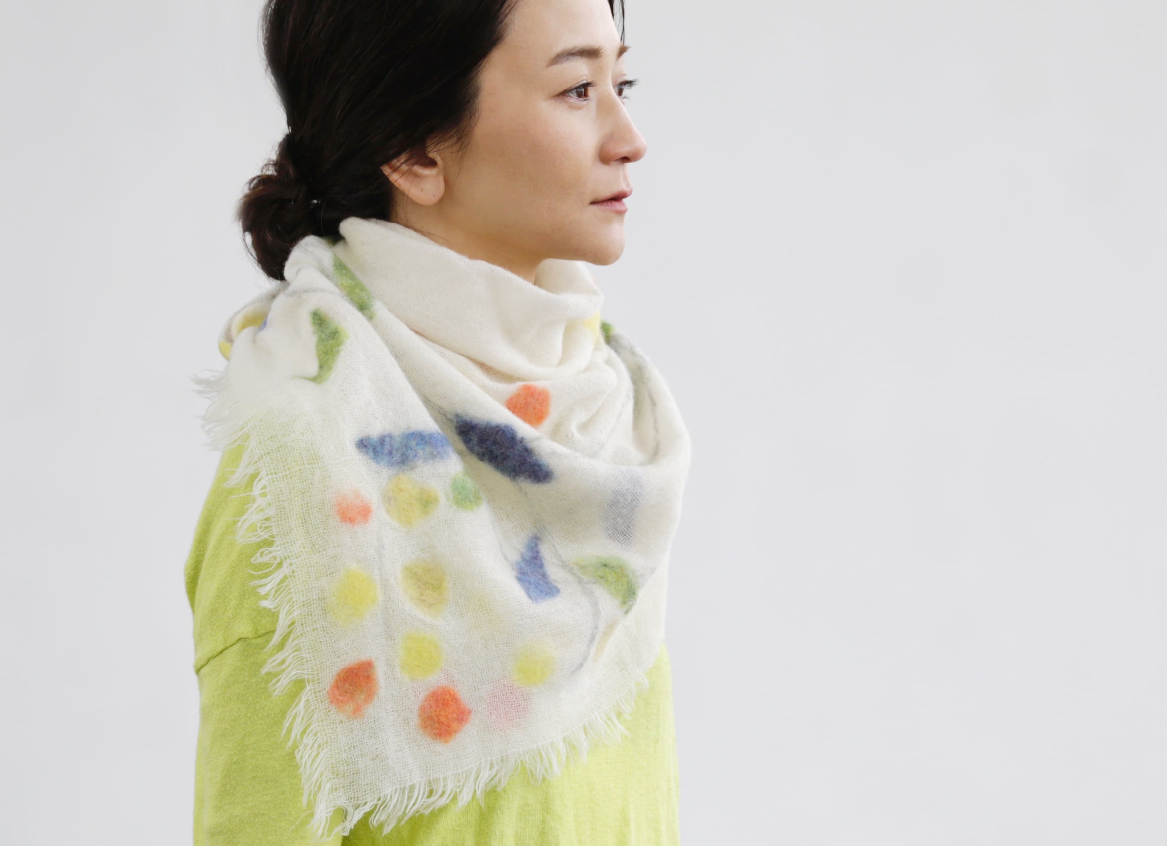 ウール100%でとにかく軽いです。ベースで使っているウールガーゼはふっくら空気を含み、やわらかで暖かな質感です。そこにオリジナルの羊毛を配置しています。とにかく極薄!「保温もでき、通気性もあり、肌触りは爽やか」。いいとこ取りのストールです。薄手で、畳むとコンパクトになりますので持ち歩きにも便利です。