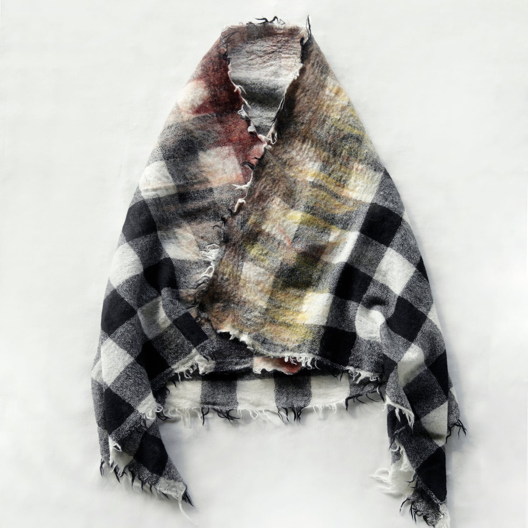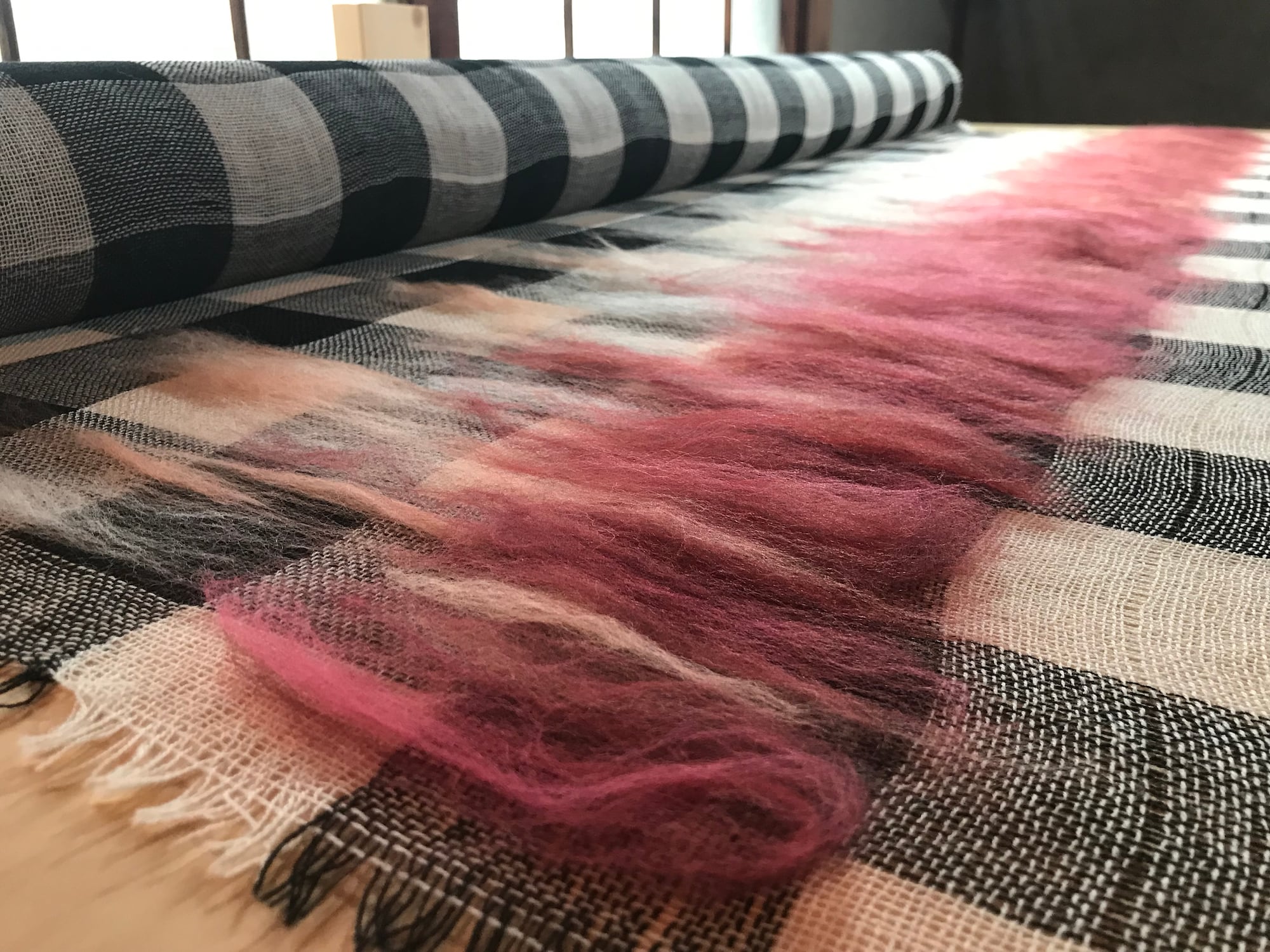 ウール100%でとにかく軽いです。ベースで使っているウールガーゼはふっくら空気を含み、やわらかで暖かな質感です。そこにオリジナルの羊毛を配置しています。とにかく極薄!「保温もでき、通気性もあり、肌触りは爽やか」。いいとこ取りのストールです。薄手で、畳むとコンパクトになりますので持ち歩きにも便利です。