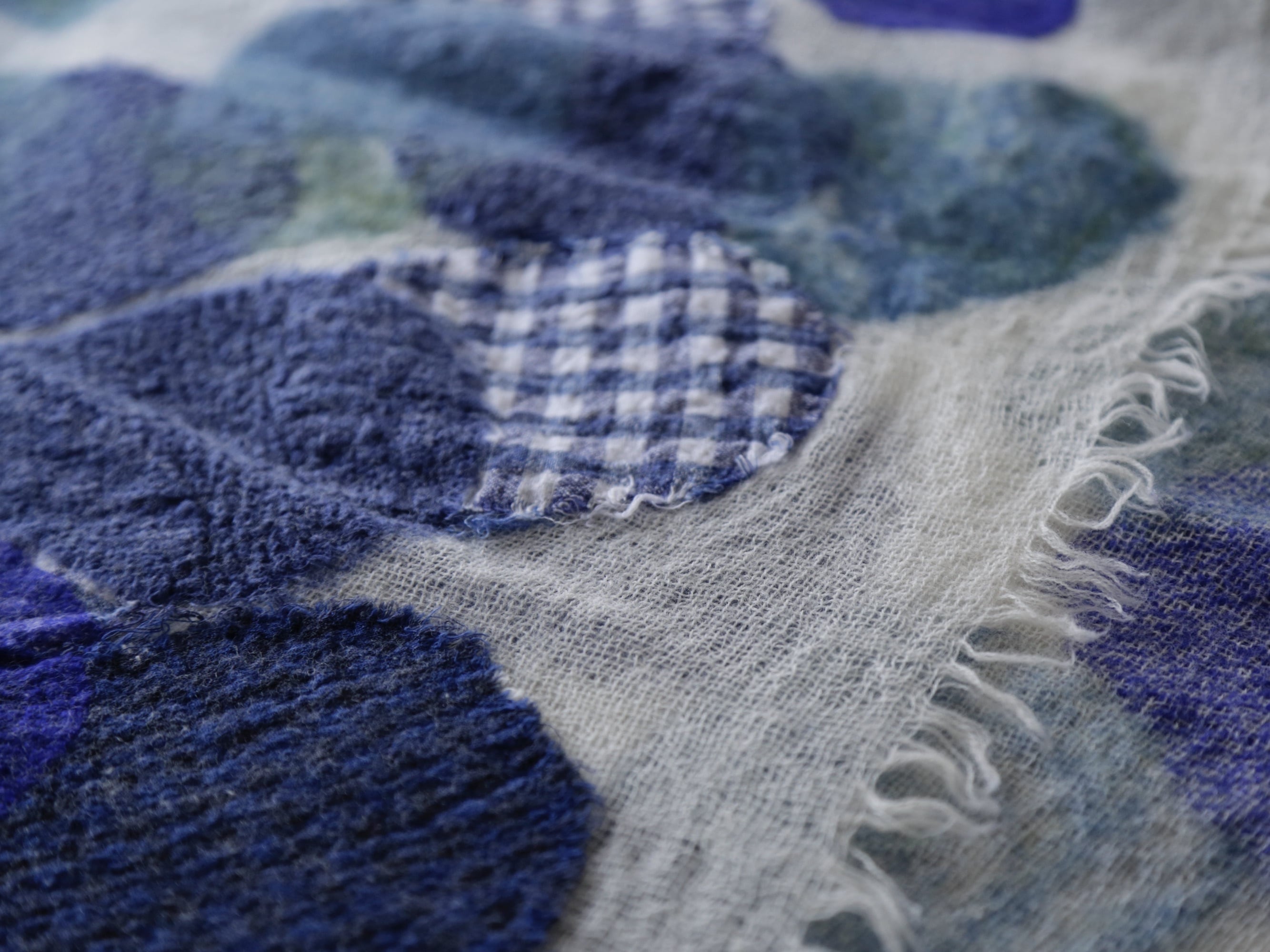 こちらのストールは配置した生地が多めに使用されているので、ルイヌノの中でも厚さがあるタイプですが、通常のウールストールくらいです。
