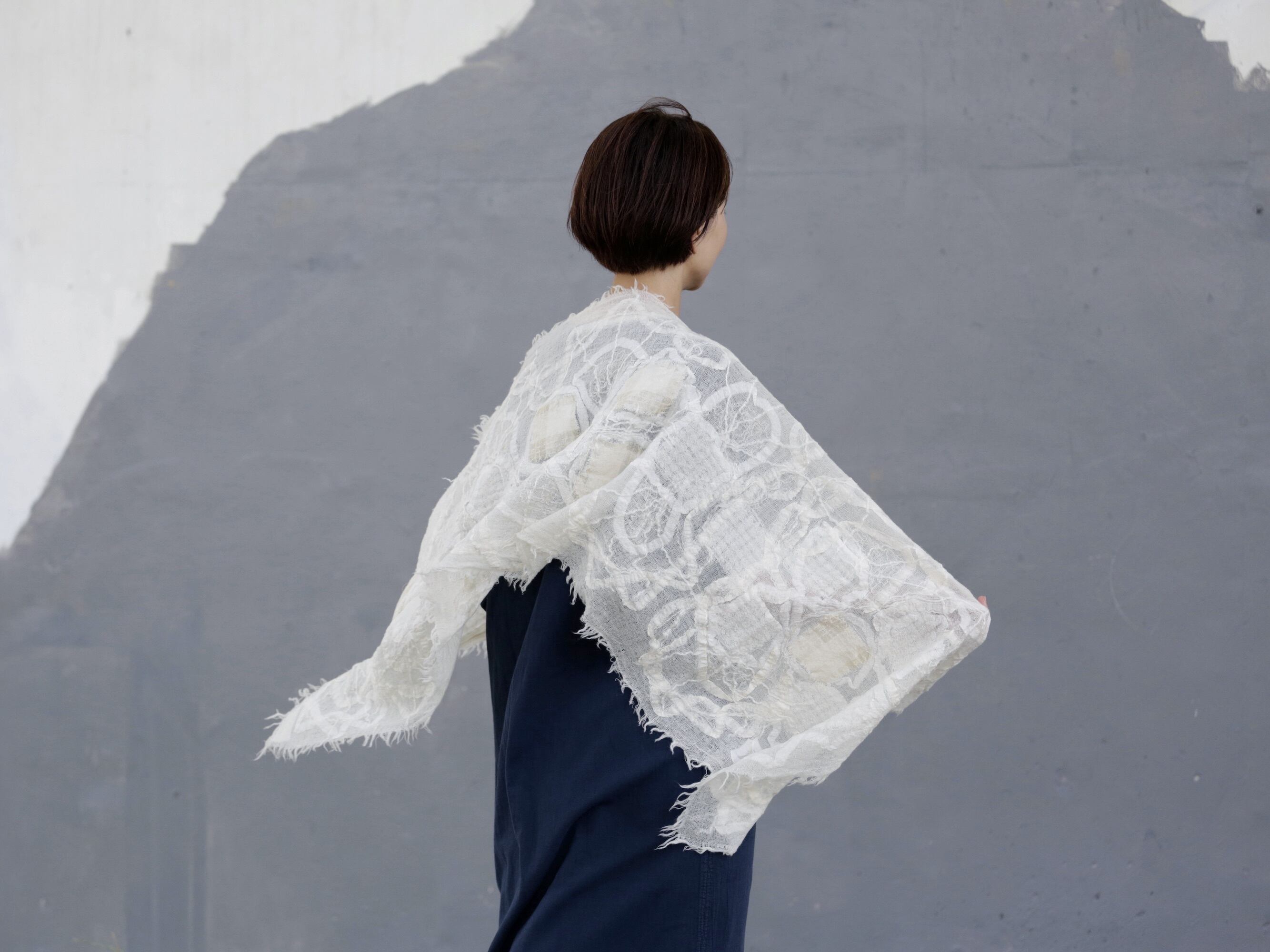 そこに麻生地やシルク生地を小さくカットして配置しています。どれも極薄!「保温もでき、通気性もあり、肌触りは爽やか」。いいとこ取りのストールです。